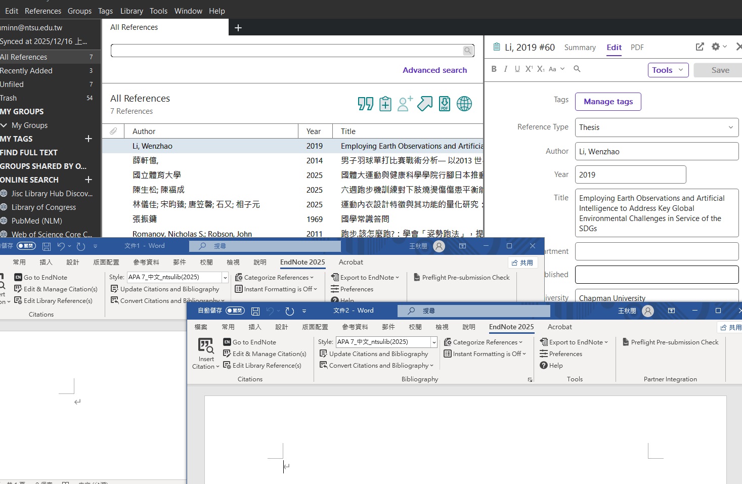 美國心理學會(American Psychological Association)論文寫作格式(APA Style,簡稱APA),常用於社會科學等領域,本校學位論文也多採用此格式。為便於同學撰寫學位期刊文章或學位論文使用,圖書館以APA第七版為基礎,主要參考中華民國體育學會APA 7中文格式指引(網頁連結),製作成國立體育大學圖書館EndNote之APA 7中文版樣式檔(style),以便快速產生一致性的引文作者呈現格式與參考文獻格式;外文資源則以EndNote原有的APA 7th為主。